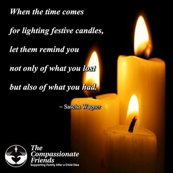 The Compassionate Friends Candle Lighting Memorial is held on the Second Sunday in December. Parents, siblings, relatives and friends join together to participate in a candle lighting ceremony that is conducted across the globe at 7:00 pm in every time zone for 24 hours in honor of our children and loved ones.